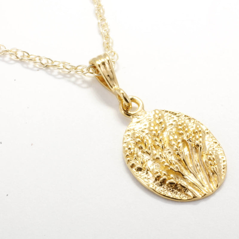 A wheat field is so majestic and beautiful and so are the individual heads of wheat. This is my 14kt Gold vermeil Wheat Field Necklace. Great Realistic Detail of several heads of wheat flowing in a field.