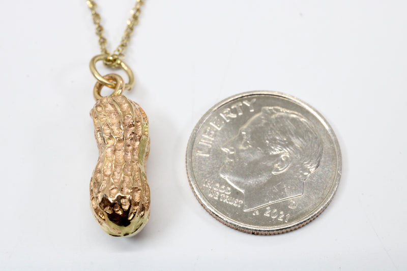 Fully three dimensional solid 14kt yellow gold peanut.